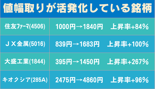 最近の物色動向では、弊社有料レポートでも取り上げた住友ファーマ(4506)、JX金属(5016)、大盛工業(1844)、キオクシア(285A)などが注目を集めました。これらの銘柄が強い値動きを見せた背景には、投機性の高い資金が相場に関与していた点が挙げられます。短期資金は「材料の鮮度」と「値動きの再現性(過去の上昇パターン)」を重視して回転を繰り返しており、浮動株が軽く需給改善が確認できる銘柄には資金が集まりやすい環境が続いています。