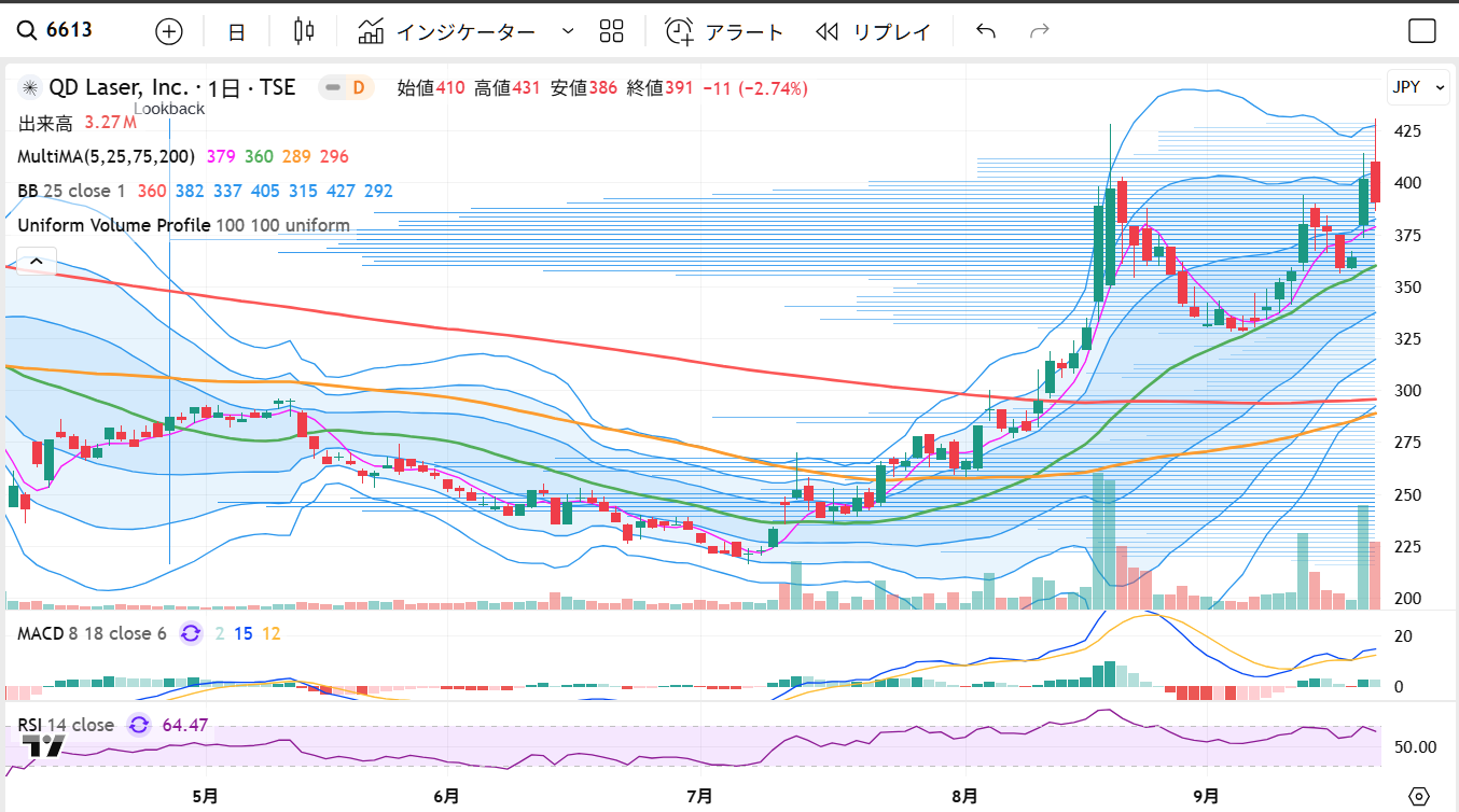QDレーザ(6613)の株価が9月中旬以降、静かに熱を帯びています。ここ数日は「中小企業成長加速化補助金」採択のニュースを受けて一時は400円台に乗せ、短期筋の資金流入と利確売りが交錯する中で急騰と急落を繰り返しています。7~9月中旬の相場は、成長期待と短期筋の売買が交錯する展開でした。