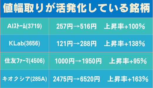 直近では、弊社有料レポートでも取り上げたAIストーム(3719)、KLab(3656)、キオクシア(285A)、住友ファーマ(4506)といった銘柄が高いパフォーマンスを示しています。これらの銘柄はいずれもテーマ性と値動きの軽さを兼ね備えており、短期筋が積極的に参入したことで一気に上昇基調を強めました。