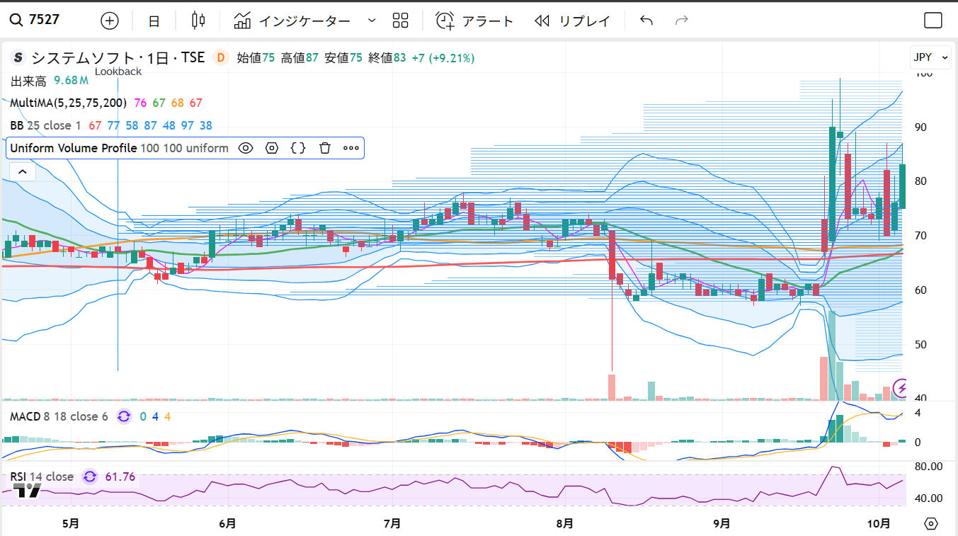 この銘柄に関しては、投機系ファンドの関与が見られ、8月に弊社有料レポートで60円台の段階から注目してきた経緯があります。短期資金が流入しやすい低位株であるため、資金の集中が起これば一気に相場が過熱する特性を持ちます。個人投資家の参加も活発で、需給が一方向に傾きやすく、流動性と投機性の双方を押し上げる構造となっています。