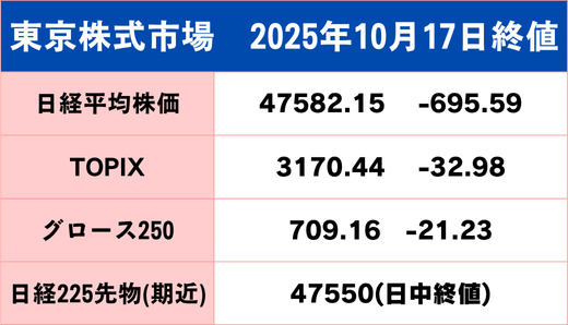 グロース市場は9月末からの自律反発局面が崩れ、この時の安値をわずかに下回って取引を終えています。また、200日移動平均(706.14)付近で下げ止まる動きも確認され、来週以降、この水準がサポートとして機能するかどうかが注目されます。