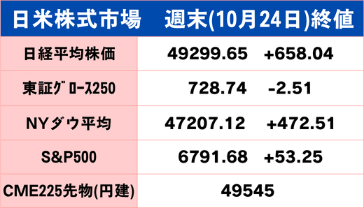 今週の日本株は、日経平均が前週比で上昇し、為替の円安進行と国内政策期待を背景に堅調な展開となりました。特に輸出関連や金融株が買われ、出来高を伴う上昇が見られました。一方、日銀が「過熱傾向への警戒」を示したことで、高値圏での持ち高調整も進みました。米国市場では、9月CPIが予想を下回ったことで利下げ期待が高まり、主要3指数がそろって過去最高値を更新。AIやテクノロジー株への資金流入が続きました。