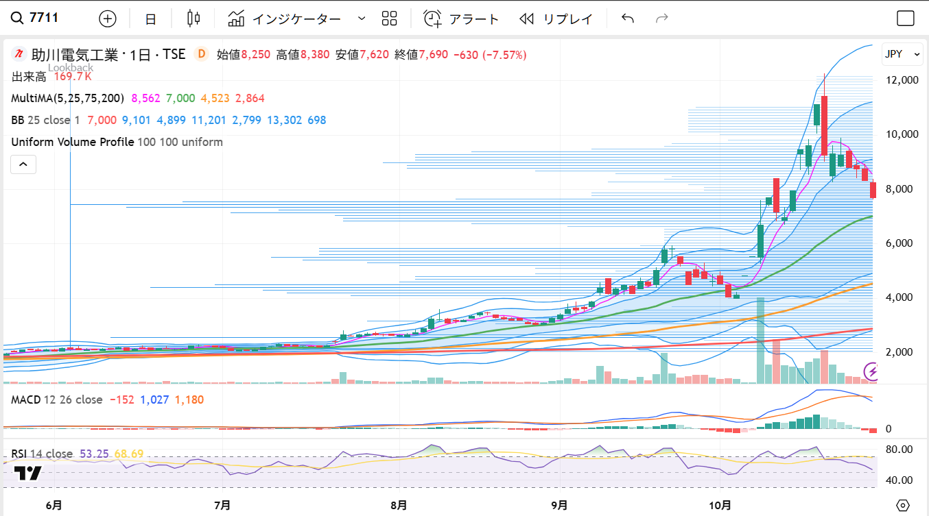 ただし、こうした実需の成長よりも、政策テーマを材料視した投機筋の仕掛けが株価を急速に押し上げた点が今回の相場の核心といえるでしょう。これらの短期筋は、低浮動株の銘柄を舞台に「業績+テーマ性」を結合させることで、需給を一気に傾ける手法を得意とします。助川電気の流通株は実質550万株前後と少なく、出来高が膨らむと需給が急速に偏ります。