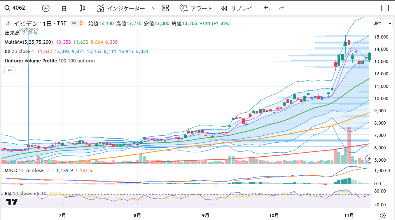 日足では、10月28日の窓開け上昇以降、25日移動平均線を上回りながら上昇基調を維持しています。短期的には13,000円を終値で維持できるかが分岐点で、この水準を保てば上昇トレンドは継続する見通しです。逆に12,500円を割り込むと過熱感の反動から調整に入る可能性があります。一方、14,500円を明確に上抜ければ、投資資金が再び循環し、年末にかけて高値更新を狙う展開が見込まれます。