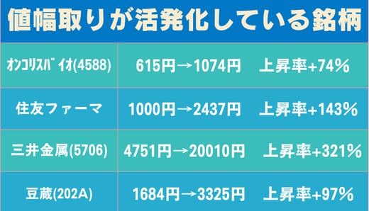 弊社の有料レポートで取り上げ、直近で高いパフォーマンスを示した住友ファーマ(4506)や三井金属(5706)、豆蔵(202A)、オンコリスバイオ(4588)などは、いずれも材料性と需給の軽さが評価され、短期資金が流入しやすい特徴を持っています。