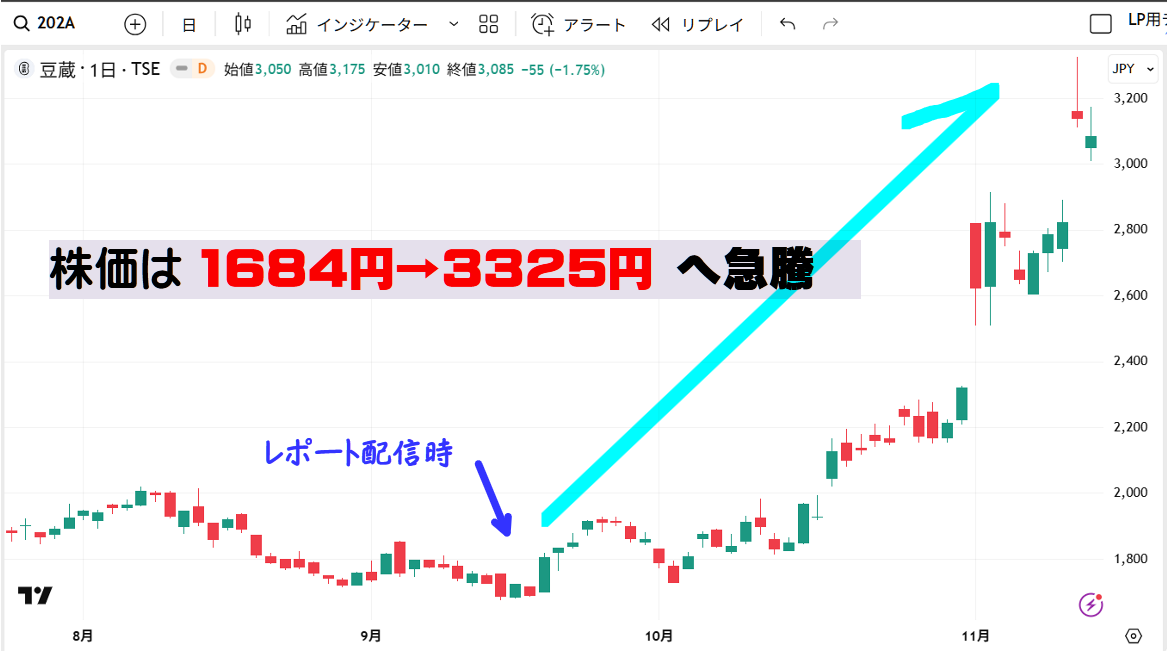 弊社の過去のレポートでも、仕込み段階の銘柄を先行して紹介し、大きな値幅を狙う投資家の皆様にご活用いただいています。今回の2銘柄に関しても、相場が本格化する前の「先手必勝」のタイミングで情報を提供いたします。
